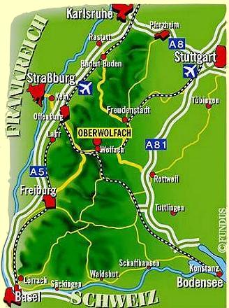 Auf der Rheintalautobahn (A5) nehmen Sie die Ausfahrt Offenburg. In Richtung Donaueschingen durch das Kinzigtal geht es zunächst auf sehr gut ausgebauten Straßen nach Wolfach (45 km). In Wolfach können Sie wahlweise durch die Stadt fahren oder die Umgehungsstraße benutzen (Tunnel).
